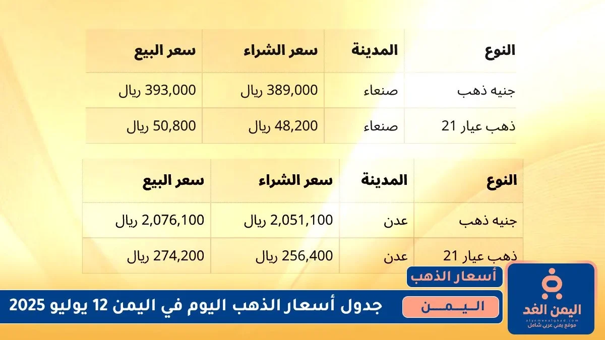 مازل الذهب يستمر في الإرتفاع في العاصمة المؤقتة عدن خلال التعاملات اليوم في الأسواق المحلية, ومن خلال الجدول التالي سوف نتعرف على أسعار الذهب في اليمن 12 يوليو 2025 صباح اليوم السبت في الأسواق اليمنية ومحلات الذهب والمجوهرات.