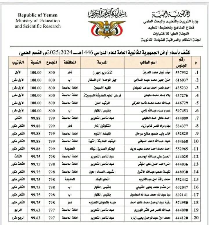 أوائل الجمهورية للثانوية العامة في اليمن أعلنت وزارة التربية والتعليم رسميًا عن نتائج الثانوية العامة للعام الدراسي 2024–2025، وجاءت قائمة أوائل الجمهورية للقسم العلمي على النحو التالي: