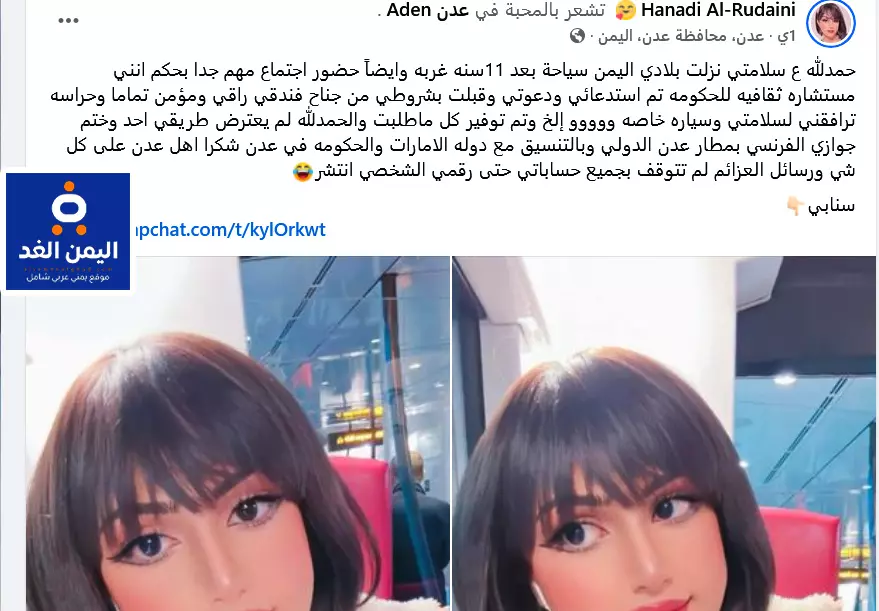 وبحسب المنشورات التي تم تداولها على حساب يحمل اسم “هنادي الرديني” على فيسبوك، تحدثت الرديني عن عودتها إلى اليمن بعد أكثر من 11 عامًا من الغياب، بدعوة من الحكومة اليمنية الشرعية.