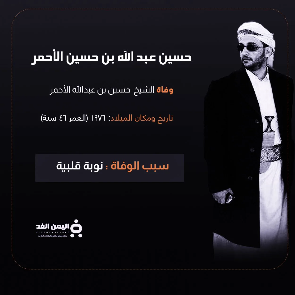 توفى يوم امس الشيخ حسين الأحمر بـ سبب نوبة قلبية كما أشارة بذلك المصادر عبر مواقع التواصل الإجتماعي , حيث تم الإعلان عن وفاة الشيخ حسين الأحمر في العاصمة القطرية الدوحة في مكان سكنه.