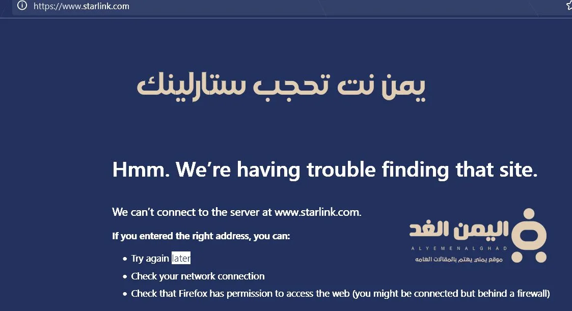 حقيقة يمن نت تحجب موقع ستارلينك starlink في صنعاء Yemen Net blocks the Starlink website الإنترنت الفضائي المقدم من شركة ستار لينك الرسمية, من قبل مؤسسها ايلون ماسك Elon Musk.