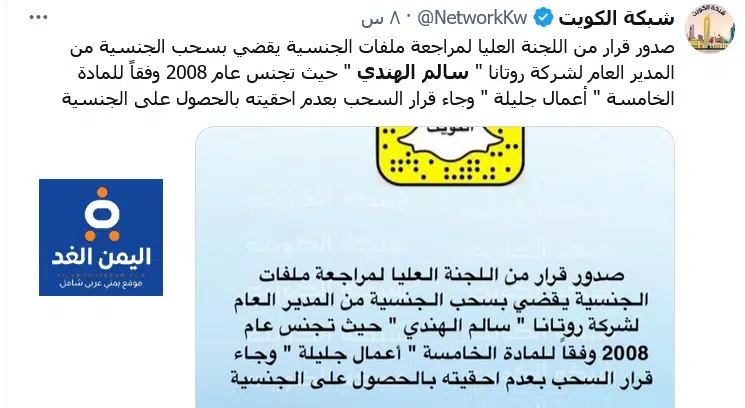 سبب سحب الجنسية الكويتية من سالم الهندي المدير العام لشركة ورتانا حيث تم الحديث خلال الساعات الماضية من خلال بعض صفحات ماقع التواصل الإجتماعي وكذلك أحدى المواقع بصدور قرار بذلك.