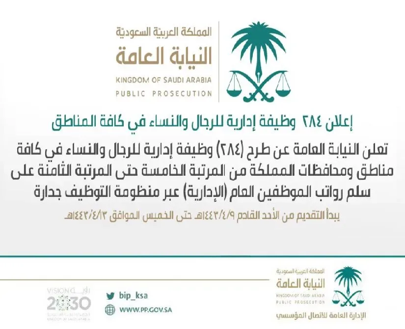 أعلنت النيابة العامة عن فتح باب التقديم لـ 80 وظيفة شاغرة في أماكن مختلفة حول المملكة للنساء والرجال الحاصلين على شهادة ثانوية أو أقل، وكجزء من معايير القبول العامة، وتم تحديد تسجيل البيانات الصحيحة التي تتطابق مع قاعدة البيانات مع السلطات المختصة والوثائق الرسمية.