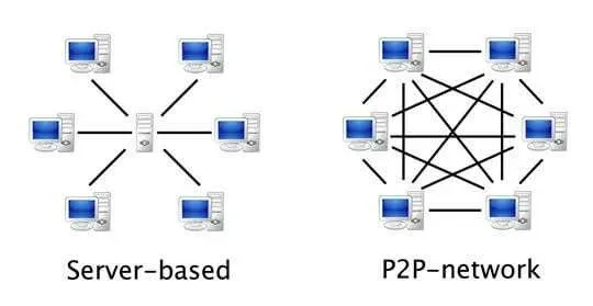 لكن ماهو الحل لمشكلة توقف او اختراق التطبيقات المركزية، الحل هو في التطبيقات اللامركزية Decentralized Applications وهي تطبيقات لا تعتمد على المركزية جملة وتفصيلا والصورة ادناة توضح الاختلاف بين النمطين المركزي واللامركزي، فبينما التطبيقات المركزية نجد ان كل الاجهزة متصلة بخادم واحد، نجد ان في اللامركزية كل الأجهزة مرتبطة مع بعضهم البعض من غير اي خادم في الوسط.