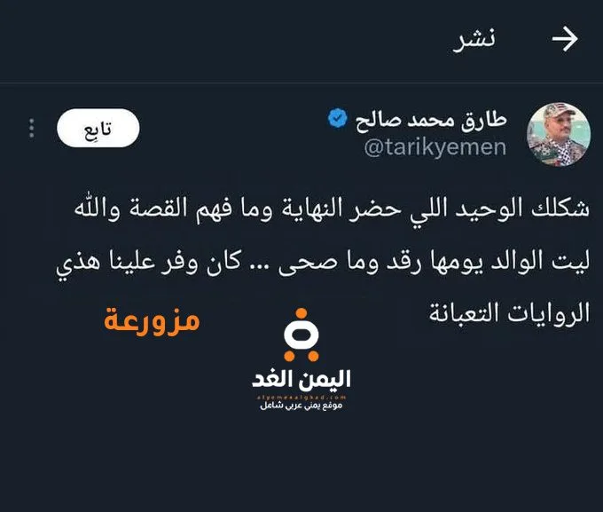 وبعد التدقيق من قبل محرر اليمن الغد إتضح ان الصورة عبارة عن صورة تم فبركتها من خلال الفوتوشوب وذلك بعد كتابة تغريدة عبر منصة إكس, ومن ثم دمجها بحساب طارق عفاش.