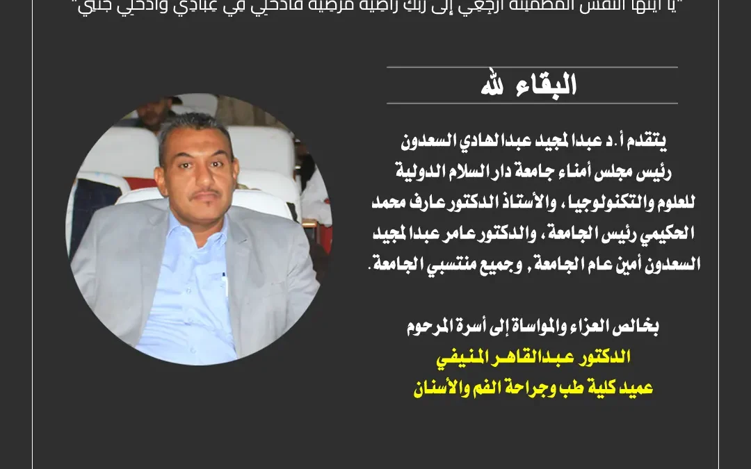 بخالص العزاء والمواساة إلى أسرة المرحوم الدكتور عبدالقاهر المنيفي عميد كلية طب وجراحة الفم والأسنان، سائلين المولى عز وجل أن يتغمده بواسع رحمته وأن يلهم أهله وذويه الصبر والسلوان وإنا لله وإنا إليه راجعون.