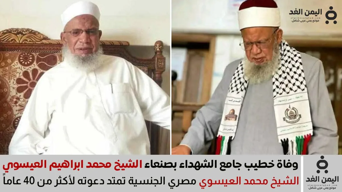 توفي اليوم الخميس الموافق 28 أغسطس 2025، الشيخ محمد إبراهيم العيسوي، إمام وخطيب جامع الشهداء في العاصمة صنعاء، وأحد أبرز العلماء والدعاة الذين تركوا بصمة مؤثرة في الساحة الدعوية اليمنية والعربية. وقد وافته المنية بعد حياةٍ حافلة بخدمة الإسلام ونشر رسالته بالحكمة والموعظة الحسنة.