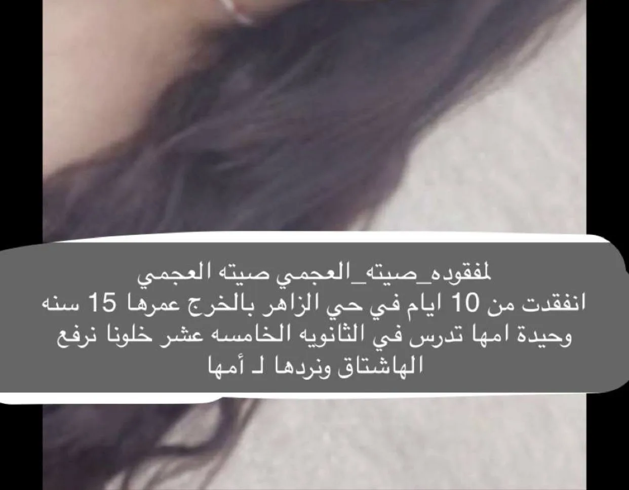 هذا وكانت أم الطفلة الشابة صيته العجمي قد نخت الجميع بالطلب بالبحث على وحيدتها صيته العجمي والتي تدرس في الثانوية في الخرج وتبلغ من العمر 15 سنة .